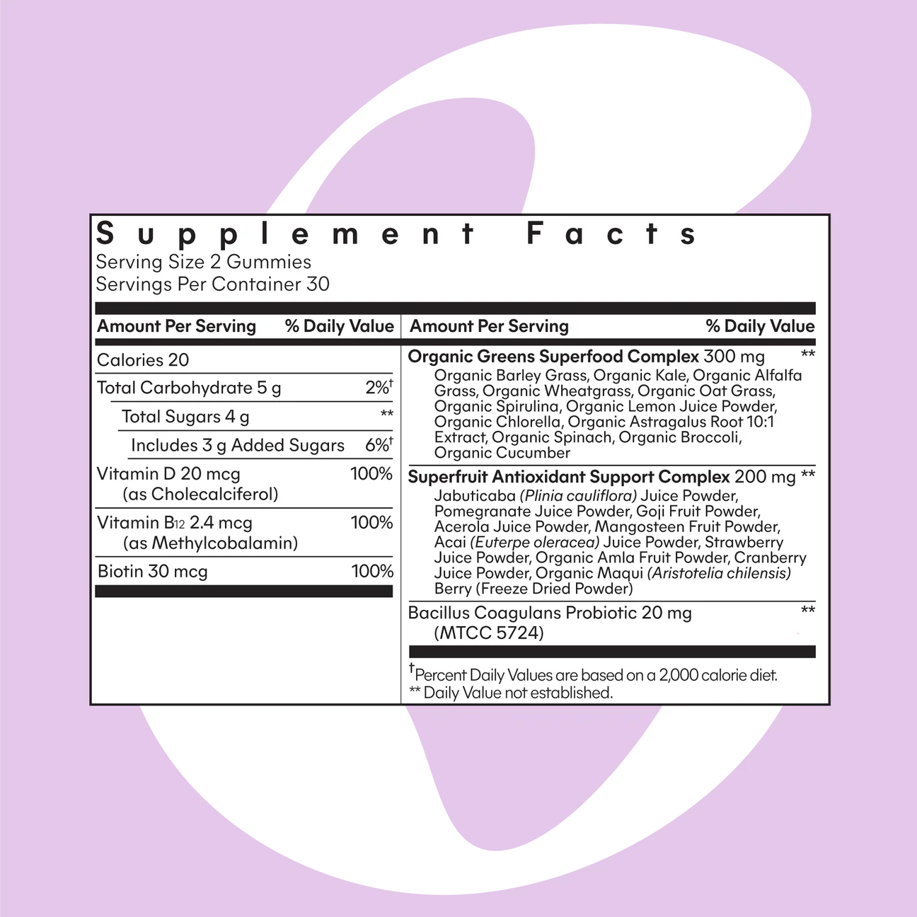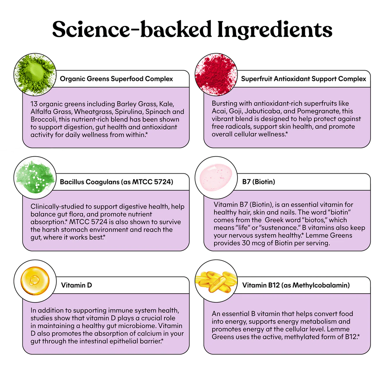 Formulated with 20+ greens and superfruits, Vitamin D3 and Methylated B12 for daily wellness. Plus clinically-studied probiotics support gut health, combat bloating and promote a healthy gut microbiome.*