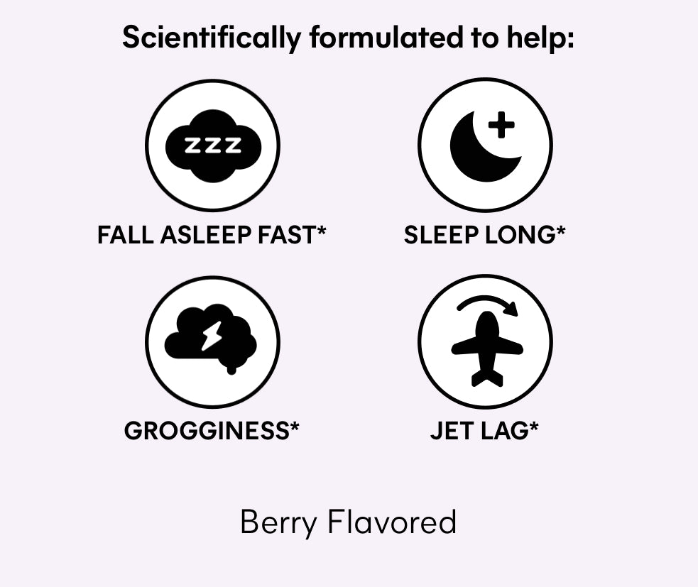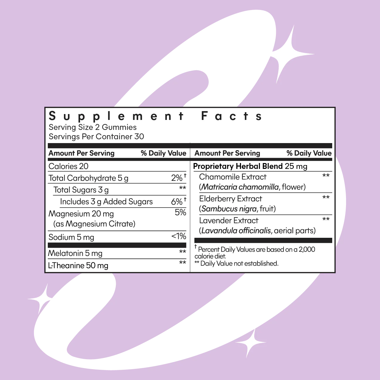 Sleep tight: Melatonin helps you fall asleep and promotes restful sleep patterns while Magnesium, L-Theanine and a dreamy blend of Chamomile, Lavender and Elderberry let you drift off in peace.*