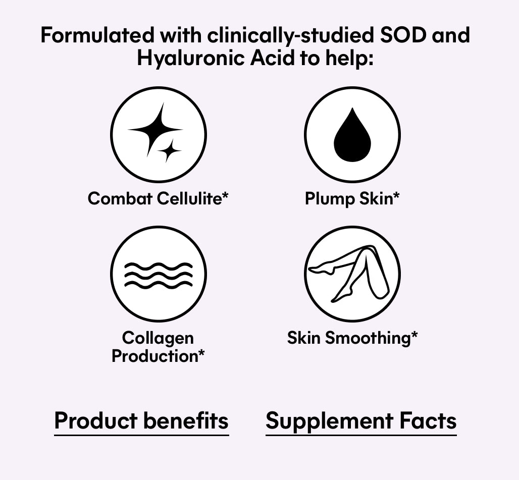 Combat cellulite, support collagen synthesis and plump skin with clinically-studied French Melon and Hyaluronic Acid. Also formulated with Bamboo Silica, Bromelain and clinically-studied Chromium.*